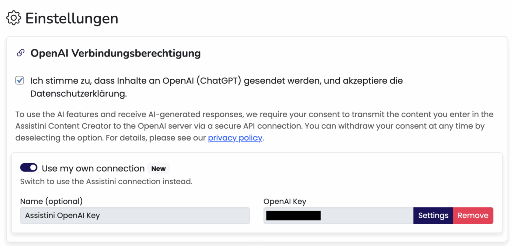 In den Assistini Einstellungen kannst du deinen eigenen OpenAI-API-Schlüssel hinzufügen. Aktiviere dafür einfach die Option „Eigene Verbindung nutzen“.