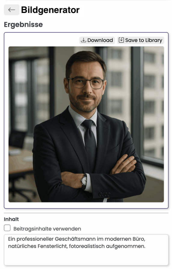 • Beispiel: „Ein professioneller Geschäftsmann im modernen Büro, natürliches Fensterlicht, fotorealistisch aufgenommen.“