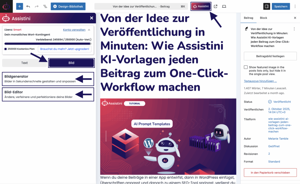 Wähle zuerst den WordPress-Beitrag aus, für den du ein Bild erstellen oder anpassen möchtest. Klicke nun auf den roten „Assistini“ Button in der oberen Leiste und wähle „Bild“ aus. Hier hast du die Möglichkeit mit dem Bildgenerator ein neues Bild zu erstellen oder via Bild-Editor bestehende Bilder bearbeiten zu lassen.