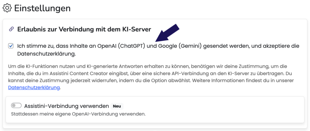 Um KI-Funktionen zu aktivieren und KI-generierte Antworten bereitzustellen, benötigen wir dein Einverständnis, die Inhalte, die du im Assistini Content Creator eingibst, sicher über eine API-Verbindung an die Server von OpenAI zu übermitteln. Du kannst deine Einwilligung jederzeit widerrufen, indem du die entsprechende Option in den Assistini Einstellungen deaktivierst. Weitere Informationen findest du in unserer Datenschutzerklärung.