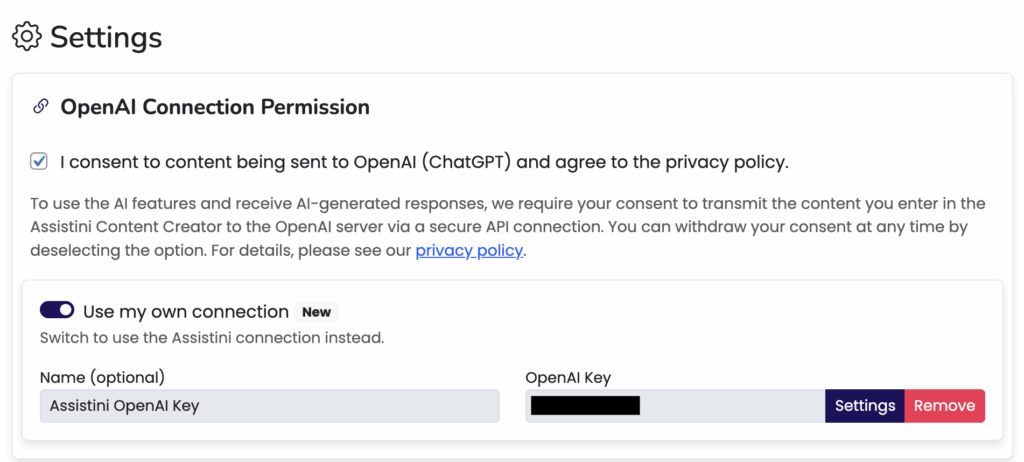 In the Assistini settings, you can add your own OpenAI API key. Simply enable the use my own connection option.